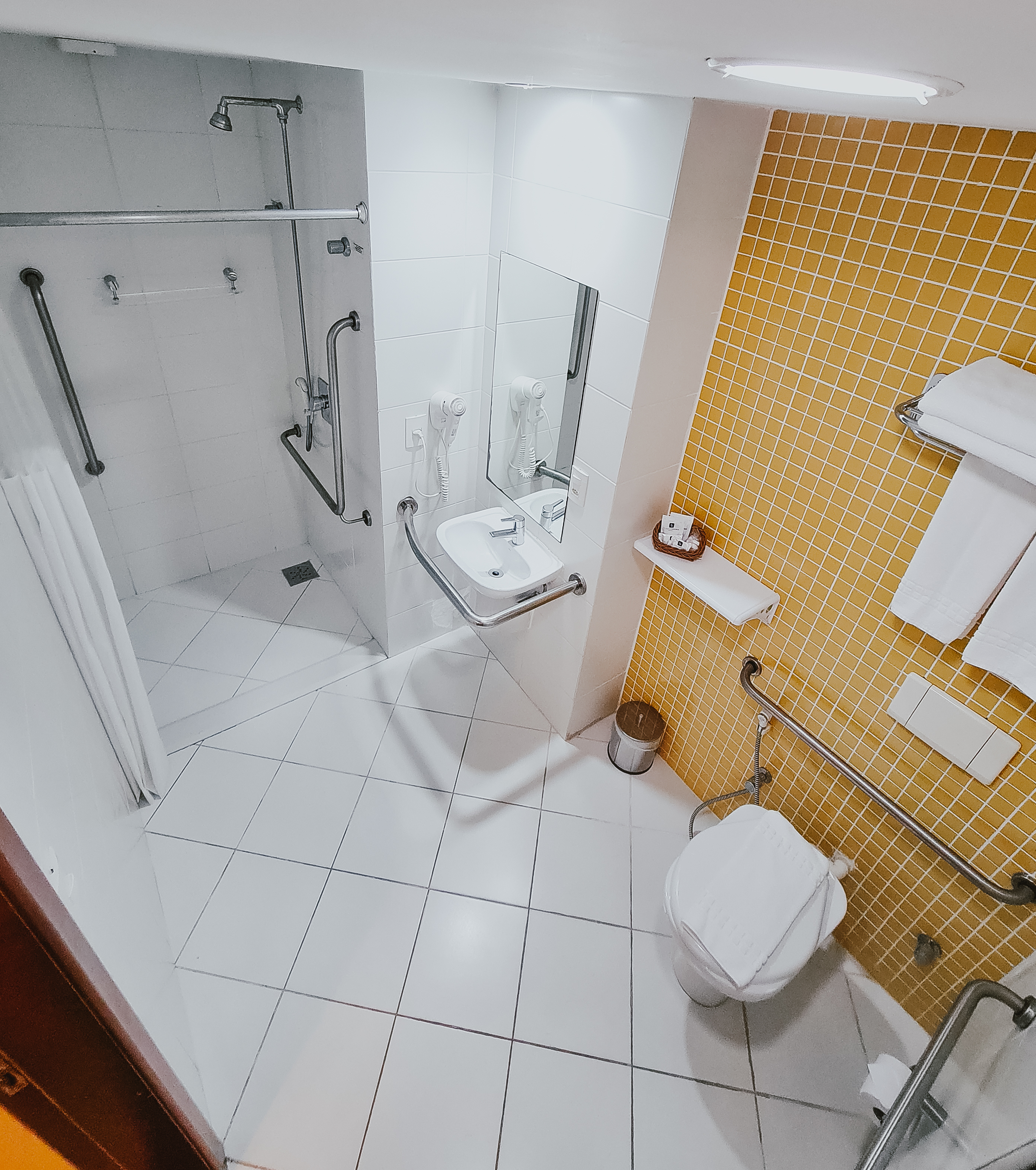 Instalações no apartamento: Os recursos de acessibilidade incluem barras de apoio ou corrimãos para ajudar a entrar e sair. Cama confortável de casal tamanho king size, TV LED SMART 43” com canais a cabo, ar-condicionado split, mesa de trabalho, internet Wi-Fi, secador de cabelo, cofre e frigobar abastecido.