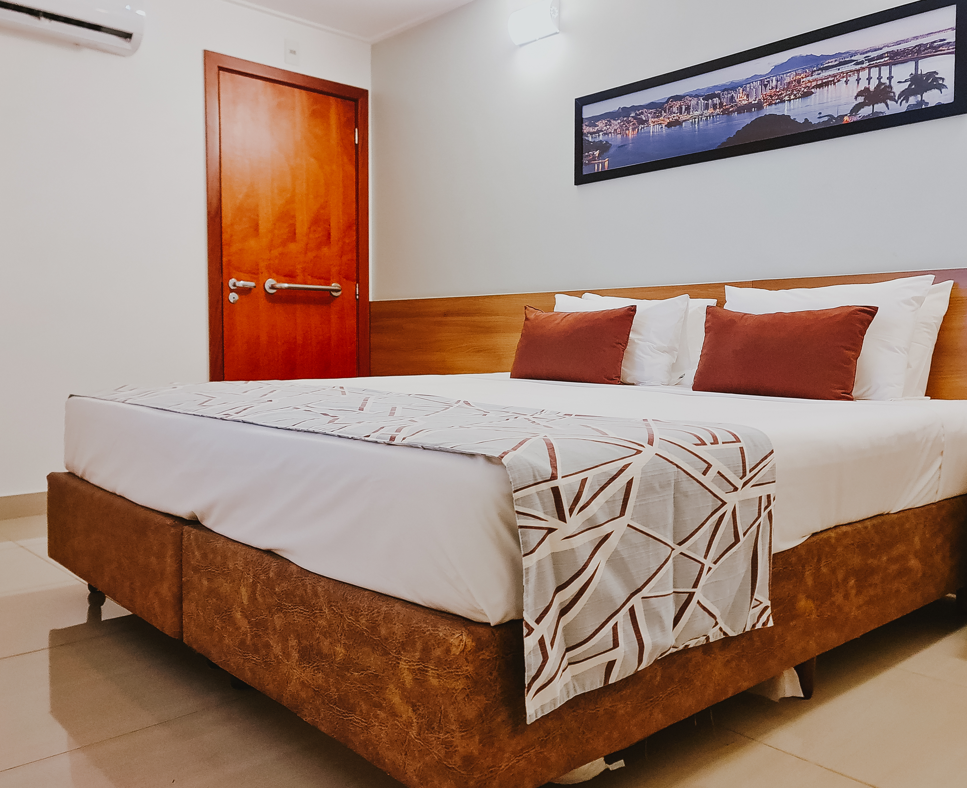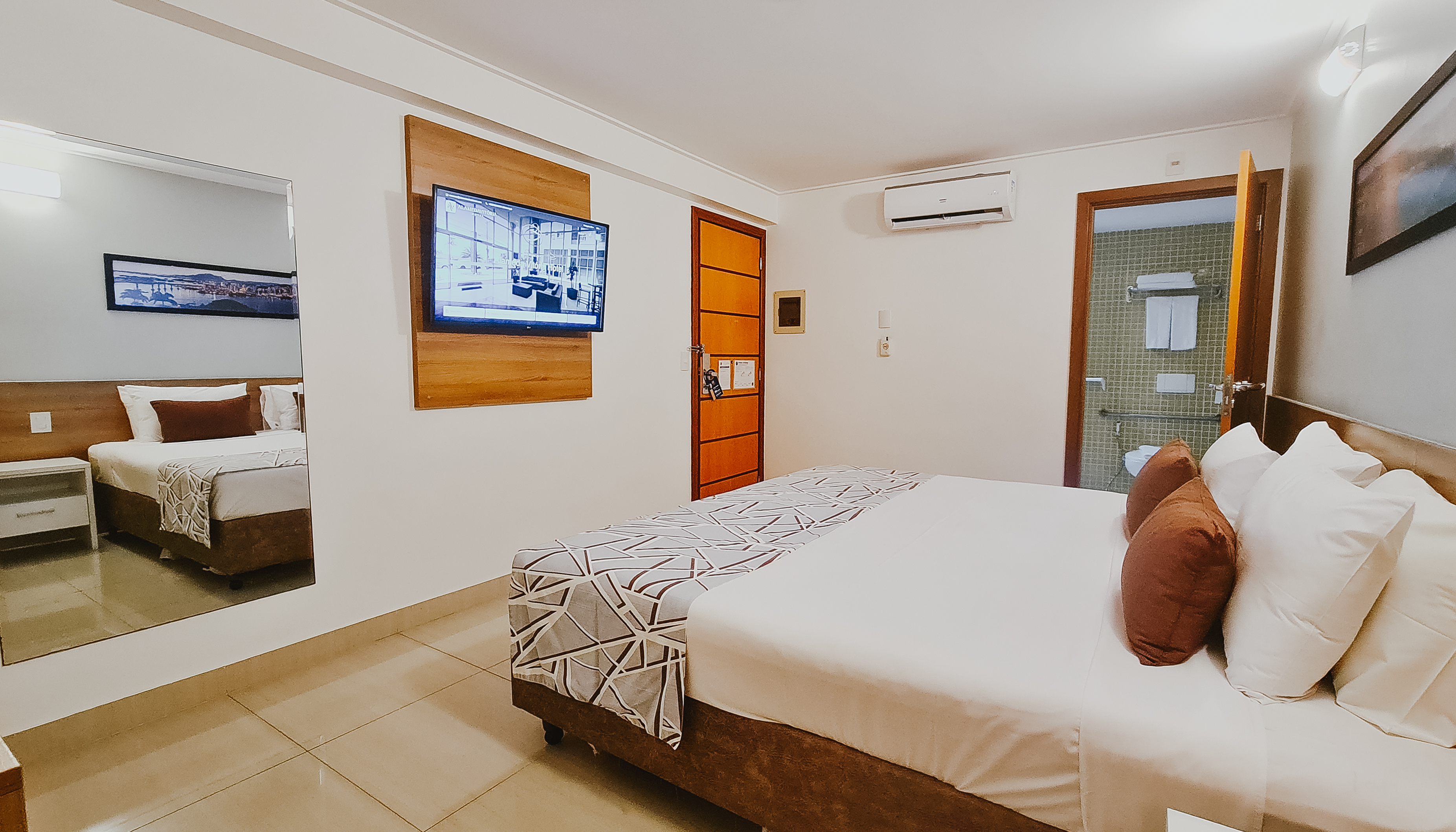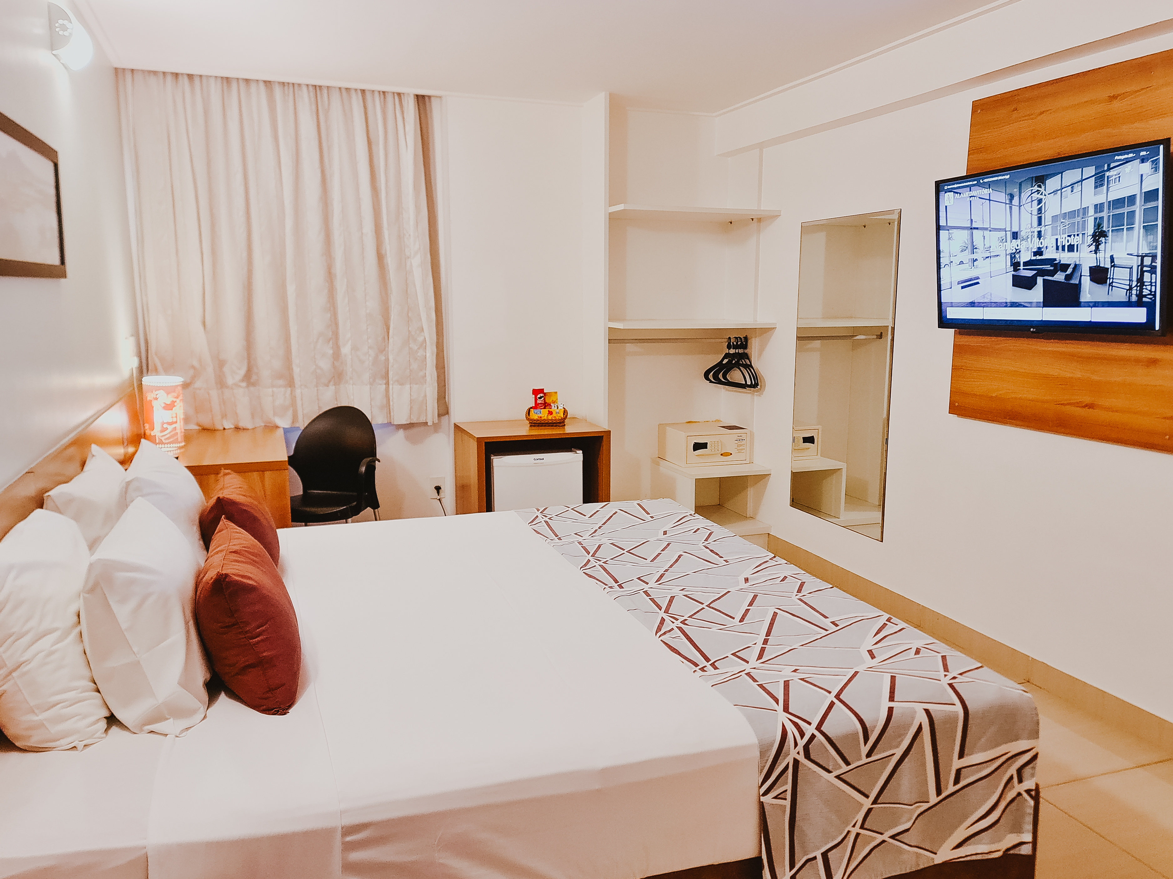 Apartamento LUXO localizado na lateral do Hotel com 22 M2, adaptado para pessoas com deficiência (PCD) e cadeirantes, cama confortável de casal king size, TV LED SMART 43” com canais a cabo, ar-condicionado split, mesa de trabalho, internet Wi-Fi, secador de cabelo, cofre e frigobar