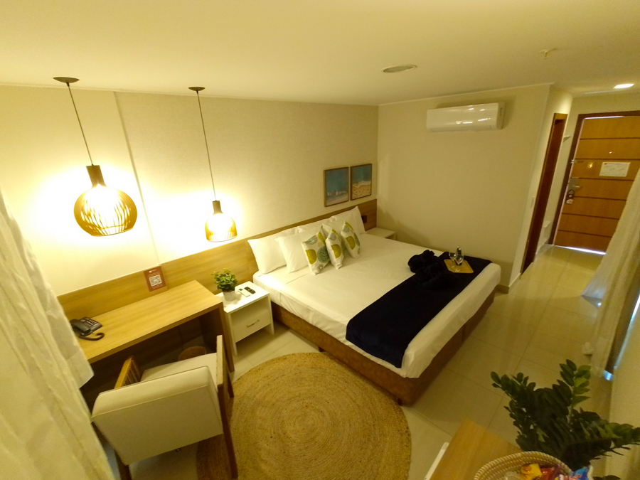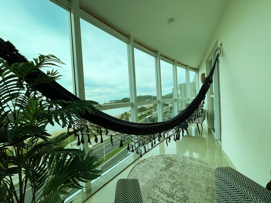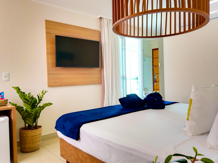 Apartamento MASTER com vista privilegiada e panorâmica da Praia de Camburi. Para quem deseja conforto e comodidade, com um design diferenciado, 24 m2, varanda, rede de descanso (suporta até 130kg), cama confortável de casal tamanho 2m x 2m (king size), TV LED SMART 43” com canais a cabo, ar-condicionado split, mesa de trabalho, internet Wi-Fi, secador de cabelo, cofre e frigobar abastecido.