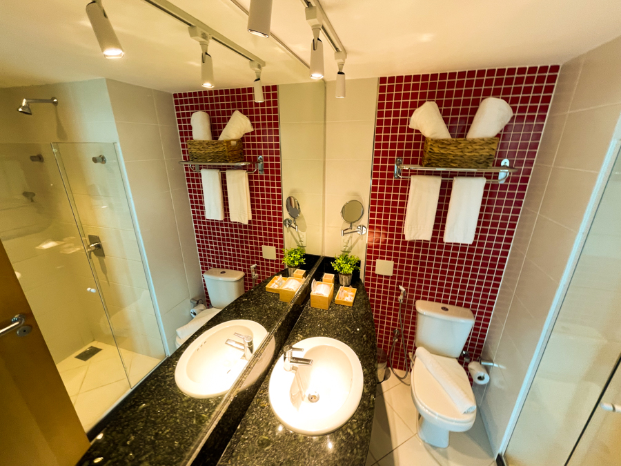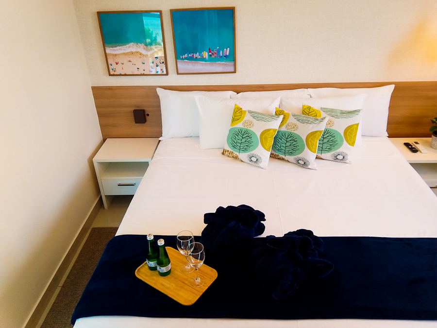 Instalações no apartamento: Varanda, Rede de descanso (suporta até 130kg), Poltrona, Piso frio, Cortina Blackout, Armário, Cofre, Ar-condicionado Split, Mesa de trabalho, Cadeira, Secador de cabelo, Produtos de toalete gratuitos (Shampoo, Condicionador e Touca), Ducha higiênica, Telefone, TV SMART LED 43" com canais a cabo, Frigobar abastecido.